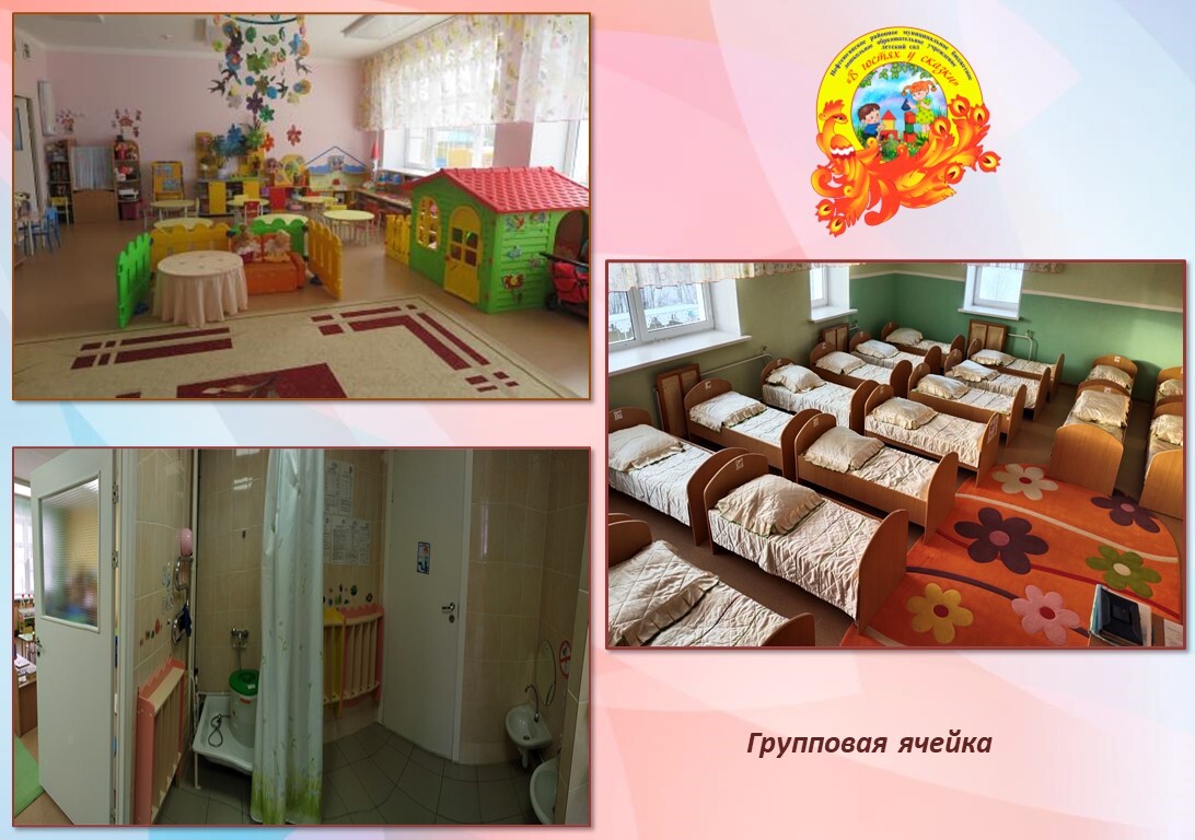В состав групповых ячеек входят: раздевальная (для приема детей и хранения верхней одежды), групповая (для проведения совместной деятельности детей и взрослых), спальня, буфетная (для подготовки готовых блюд к раздаче и мытья столовой посуды) с изолированным входом, туалетная, умывальная. Санитарный узел, разделен на умывальную и туалеты. Все туалеты в группах оборудованы индивидуальными кабинками.