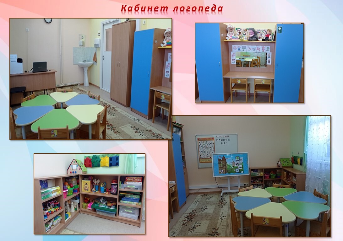В логопедическом кабинете созданы комфортные условия для занятий с детьми. Обязательным атрибутом кабинетов является большое зеркало. Игры, игрушки, пособия размещаются на стеллажах. Имеются: магнитные доски, мольберты, на которых малыши могут рисовать, складывать разрезные картинки или плоские сборные игрушки. В шкафу хранится сменный материал по всем изучаемым лексическим темам (крупные предметные и сюжетные картинки, настольно-печатные дидактические игры и пособия для уточнения и расширения словаря, формирования и совершенствования грамматического строя речи, фонетико-фонематических представлений, связной речи, зрительного гнозиса и конструктивного праксиса, неречевых психических функций). В кабинете имеются наборы муляжей, крупные и мелкие игрушки по всем лексическим темам, конструкторы, мозаики, кубики, пирамидки, матрешки и другие сборные игрушки, настольный материал для обыгрывания предусмотренных программой сказок. В логопедическом кабинете имеется интерактивный стол, наглядный материал, используемый для обследования устной речи детей и развития речи, систематизированный по темам.