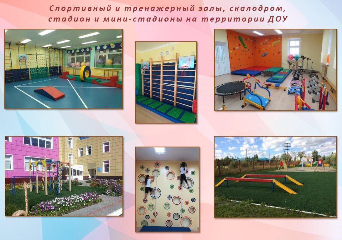 - Тренажерный зал - помещение со свободной от предметов разминочно-игровой зоной и зоной различного оборудования основу которого составляют тренажеры, выполнение движений на которых носит циклический характер: «Беговая дорожка», «Велотренажер», «Диск здоровья», «Педаль». Кроме того в достаточном количестве имеется стандартное физ.обрудование для выполнения физических упражнений и основных видов движений: скалодром , батут (80-123см), пресс-доска (штанга), степ-доска, твист.